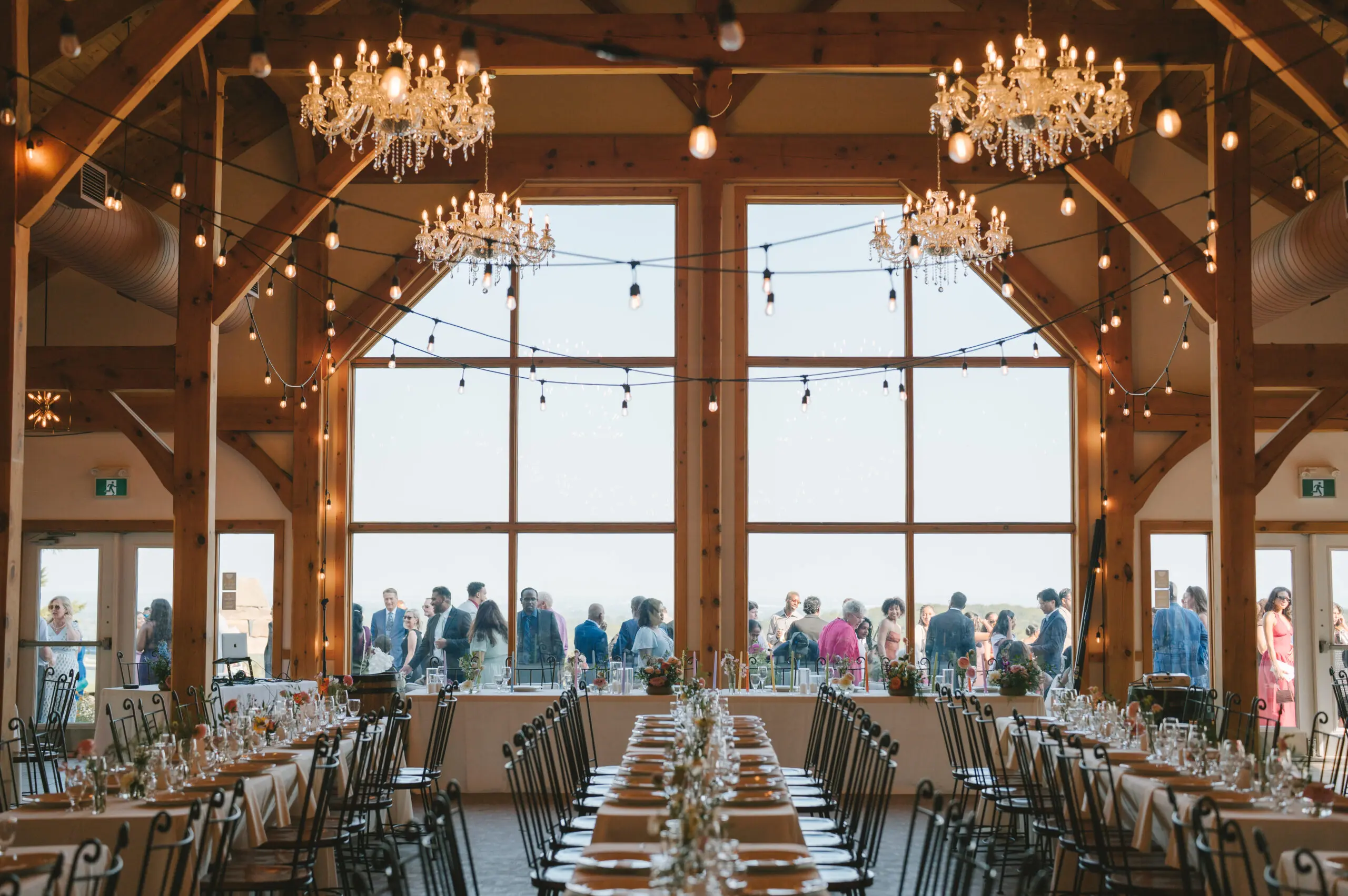 Our main chalet features vaulted ceilings, market lighting, and forest-framed windows—ideal for large gatherings, seated dinners, and social receptions with access to patios and fire pits.